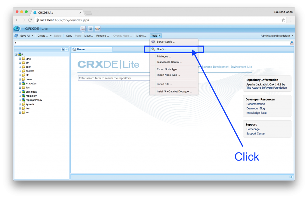 The best way to learn the power of the JCR-SQL2 language is to try it out on CRX/DE Lite. Without future or do, below will be a lesson on JCR-SQL2. To locate CRX/DE Lite’s query tool, visit http://localhost:4502/crx/de/index.jsp, then select on the tools drop down, and choose query.