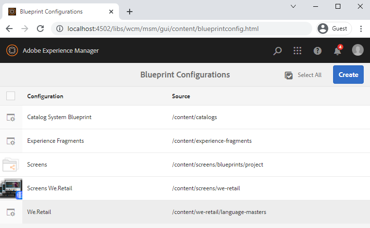 Creating one is simple, simply navigate to the blueprintconfig.html page, next on the top right hand side, click on create. Next, click on the blueprint template option, and press next, and finally set the source to the language masters folder, in this tutorial we will use the we-retails language-masters folder. Give it a title and description. Done.
